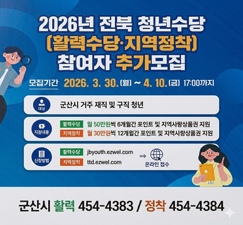 2026년 전북 청년수당(활력수당, 지역정착) 지원사업 참여자 추가모집 안내1. 우리 시에서는 청년들의 구직활동 지원 및 지역정착을 지원하기 위해 2026년 전북 청년수당(활력수당,지역정착) 참여자를 추가모집하고 있습니다. 가. 전북형 청년활력수당 1) 추가모집기간: 2026. 3. 30.(월) ~ 4. 12026.03.27
