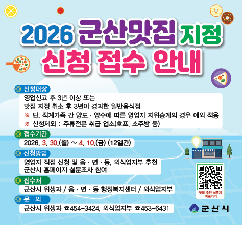 군산시민발전(주) 경력직 직원 합격자 발표 및 임용 후보자 등록요령 공고(수정)군산시민발전주식회사 공고 제2026-7호 군산시민발전주식회사 경력직 직원 합격자 발표 및 임용 후보자 등록요령 공고 군산시 출자기관인 군산시민발전주식회사 경력직 직원 채용 심사 합격자 및 임용 대상자의 등록요령을 다음과 같이 공고합니2026.03.26