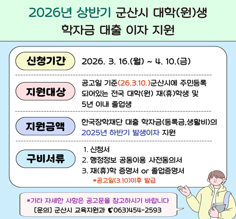 군산콘텐츠팩토리「애니메이션 더빙 체험」교육생 모집군산콘텐츠팩토리에서 초등학생을 대상으로 『애니메이션 더빙 체험』 교육이 진행됩니다.애니메이션 장면에 맞춰 대본을 읽고 직접 녹음하며, 주인공 캐릭터에 나의 목소리를 입혀보는 특별한 더빙 체험 프로그램입니다.🎧모집대상 : 관내 초등학2026.03.09