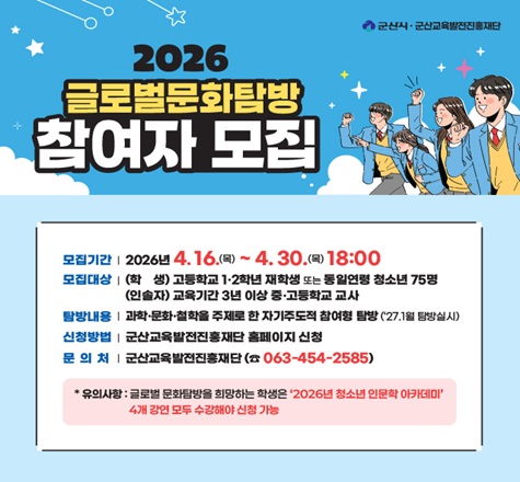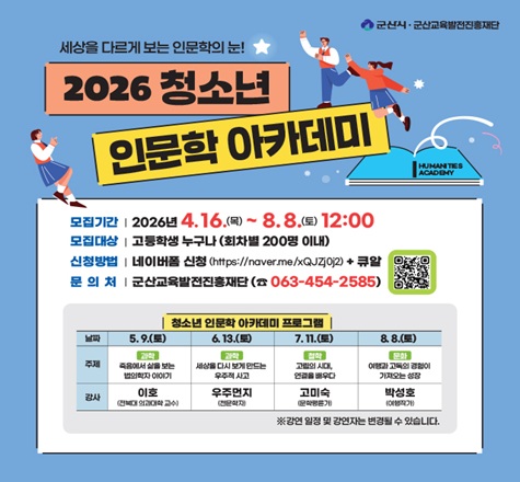 2026년 군산시평생학습관 정규 2기 프로그램 수강생 모집 ○ 접수기간 (인터넷) 2026. 4. 29.(수) 9시 ~ 5. 6.(수) 18시 (방 문) 2026. 4. 30.(목) 9시 ~ 18시 ○ 운영강좌 : 55개 강좌(1인2