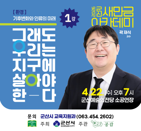 군산새만금아카데미 제1강(곽재식 교수 초청강연-그래도 우리는 지구에 살아야 한다)군산새만금아카데미에서는 곽재식 교수를 초청하여<기후변화와 인류의 미래-그래도 우리는 지구에 살아야 한다>란 주제로 강좌를 다음과 같이 운영하오니 관심있는 시민여러분의 많은 참석 바랍니다. 가. 일 시 : 2026. 4.2026.04.07