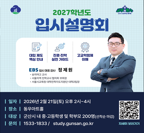 2027학년도 입시설명회 안내📢 2027학년도 입시설명회 안내 2027학년도 대입, 뭐가 어떻게 달라질까?EBS 입시대표 강사 정제원 선생님께서대입 제도부터 진로진학 실전 가이드, 고교학점제까지핵심만 쏙쏙 정리해드립니다. 📅 일시 : 2026. 2. 21.(2026.01.28