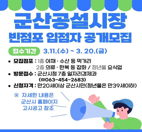 (재)군산시상권활성화재단 기간제근로자 채용 공고(재)군산시상권활성화재단에서 기간제근로자를 아래와 같이 공개모집 합니다. 1. 채용인원 및 분야 : 1명(상권활성화사업 업무보조)2. 공고기간 : 2026. 3. 10.(화) ~ 3. 20.(금)3. 접수기간 : 2026. 3. 162026.03.10