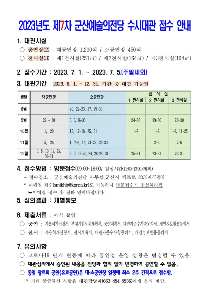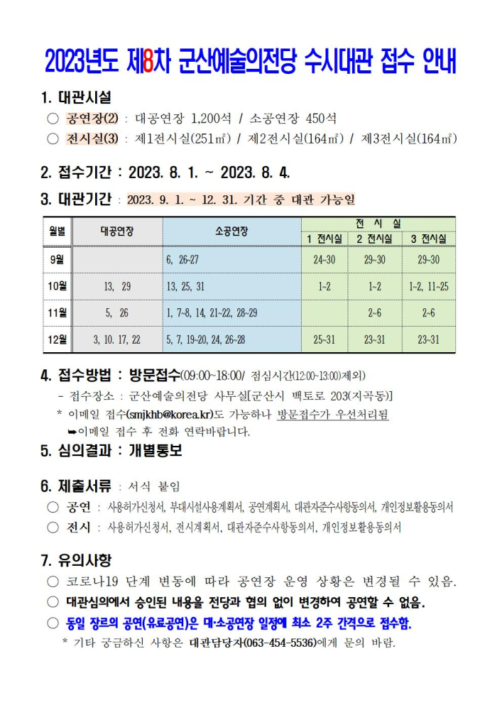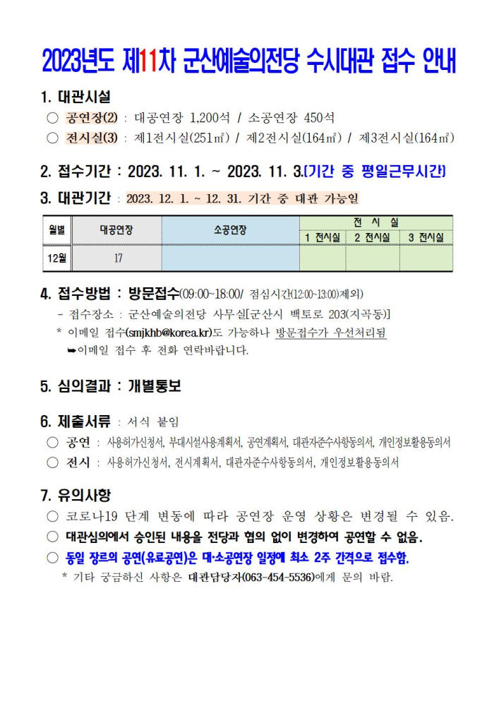 49 2023년도 군산 예술의전당 수시대관(11차) 접수 안내 다운받기 예술의전당관리과 23.10.30 804