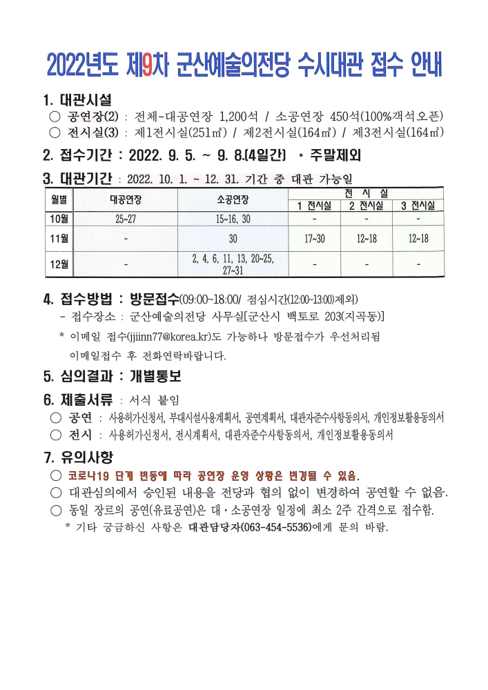 32 2022년도 군산예술의전당 수시대관(제7차) 접수 안내 - 8월 잔여일, 10월 다운받기 예술의전당관리과 22.06.29 1272