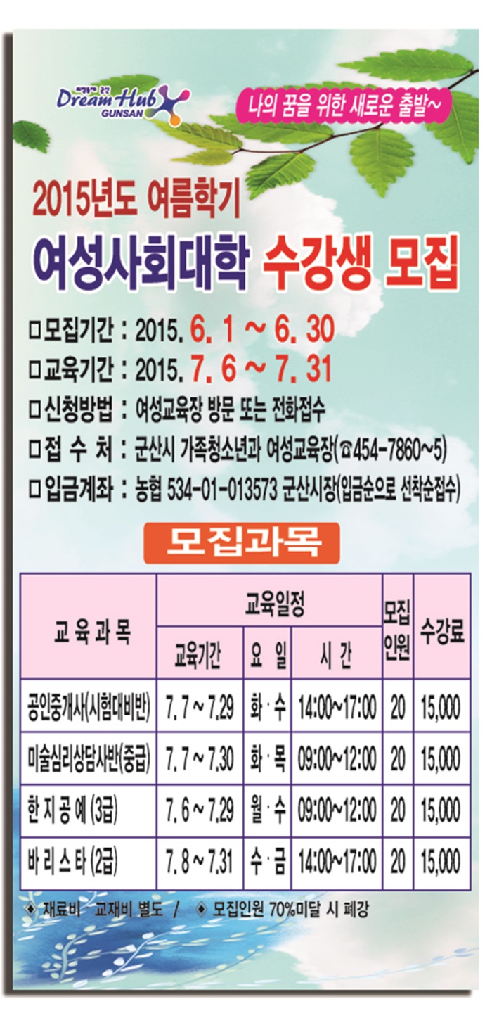 96 [알림] 2015 여름학기 여성사회대학 수강생 모집 다운받기 예술의 전당 15.06.02 1292