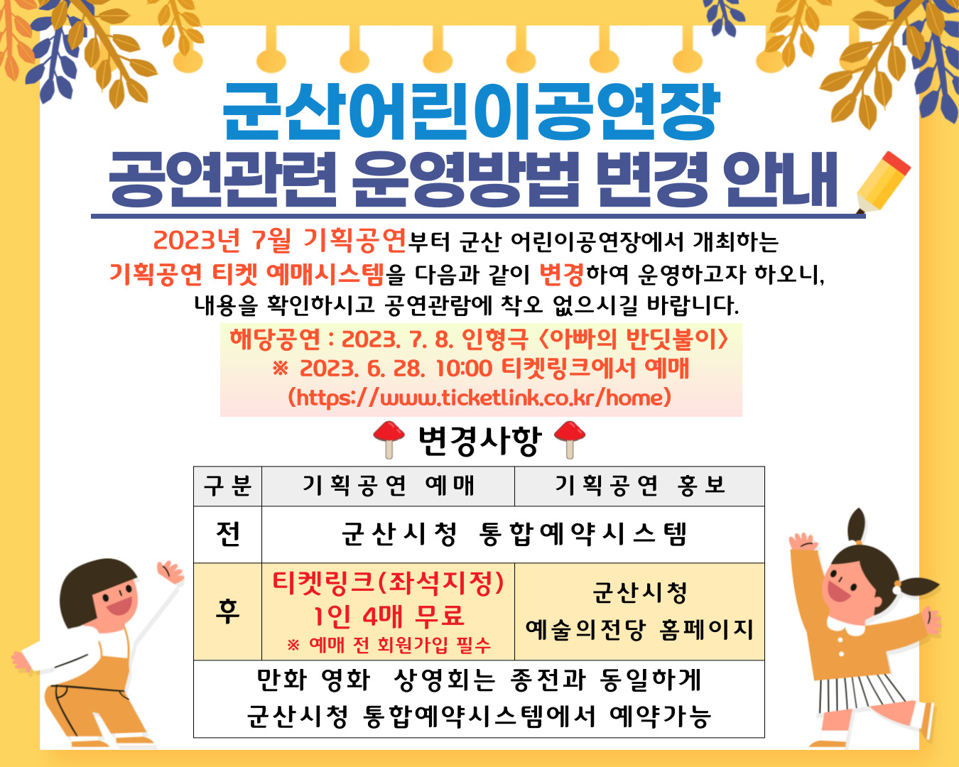 이에, 2023. 7. 1.부터 군산 어린이공연장에서 개최하는 기획공연 및 만화 영화 상영을 다음과 같이 변경하여 운영하고자 하오니,
