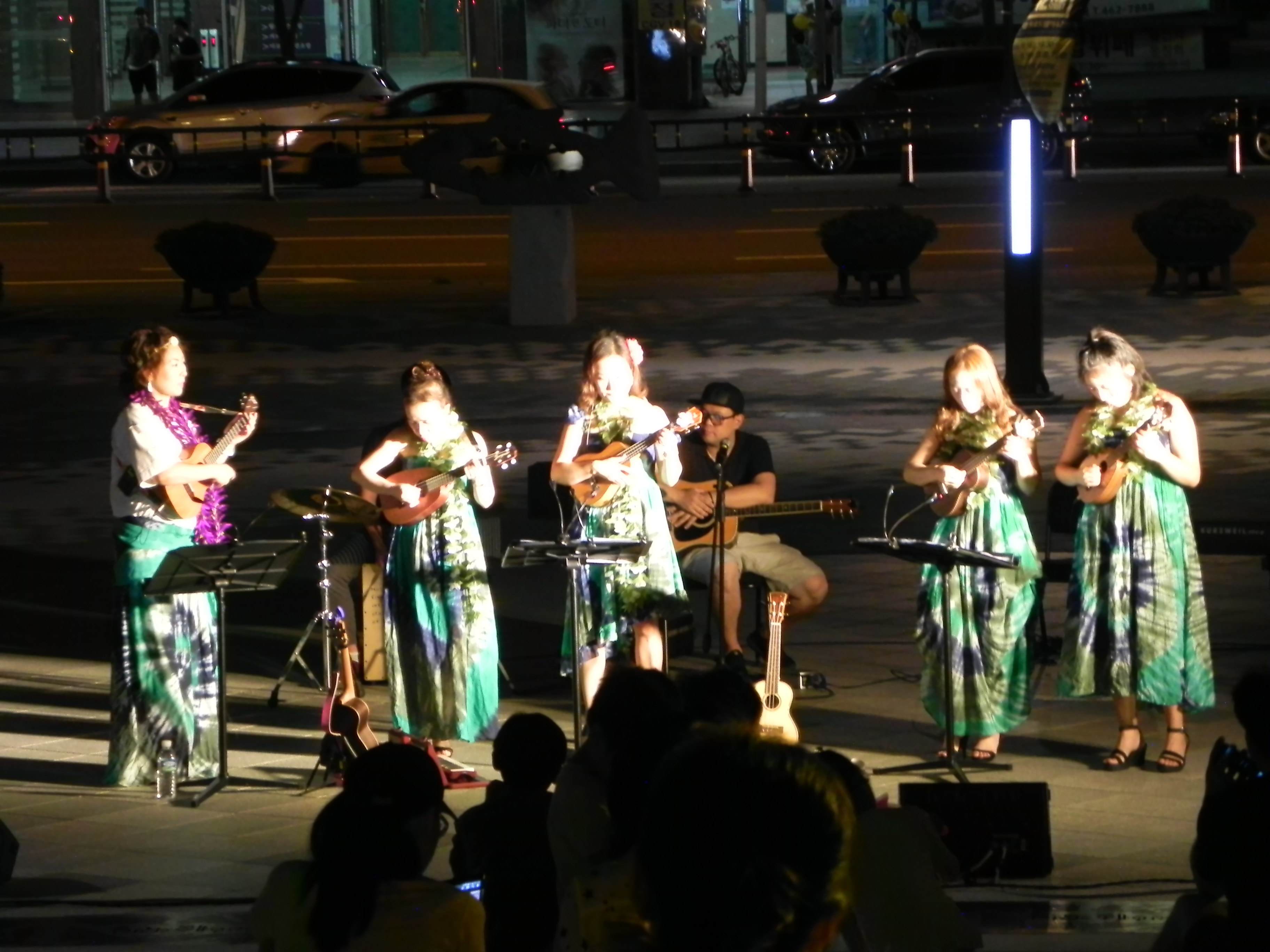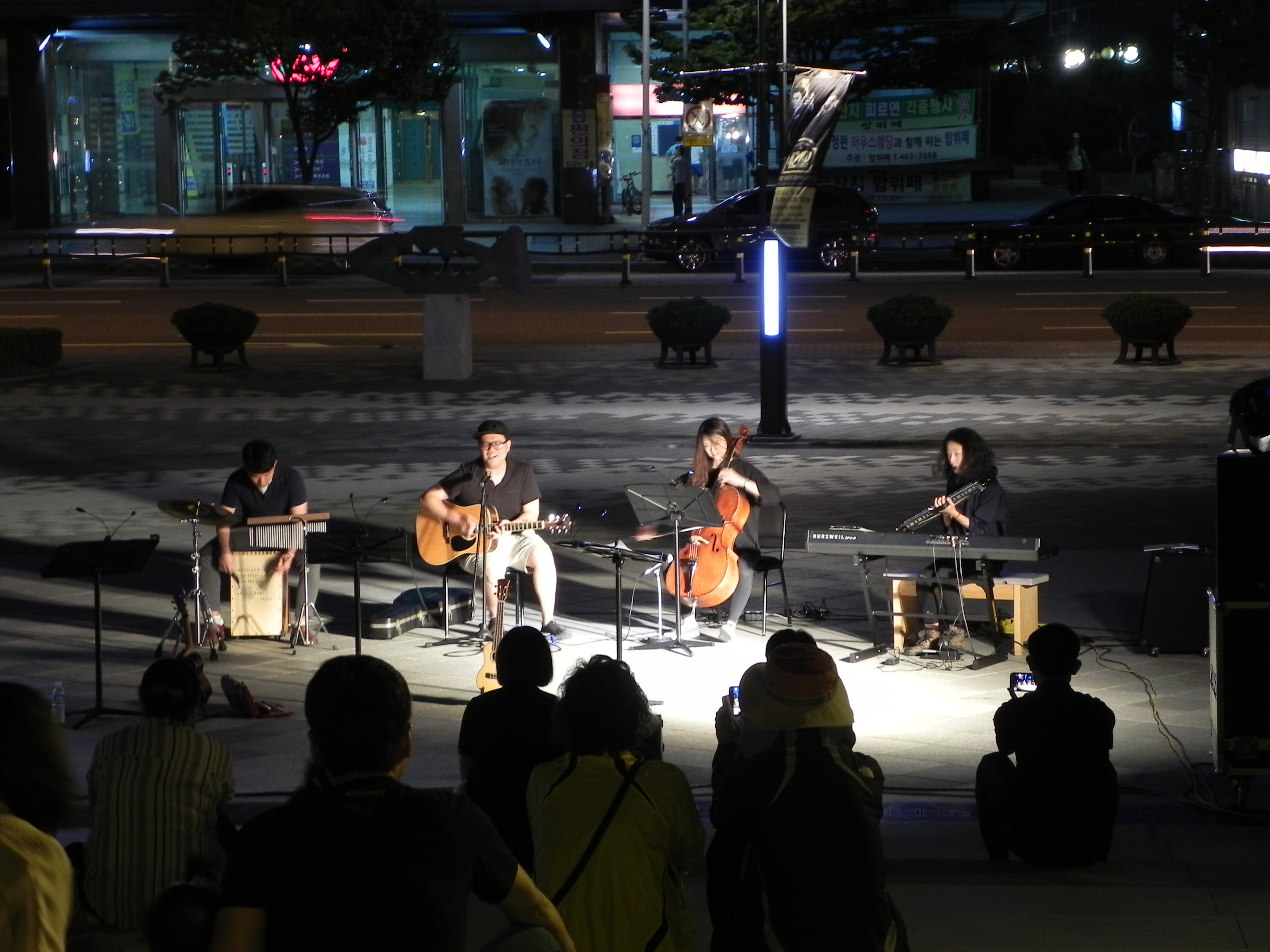 예술의전당 광장에서 이루어진 우쿨렐레의 버스킹 공연 사진입니다.