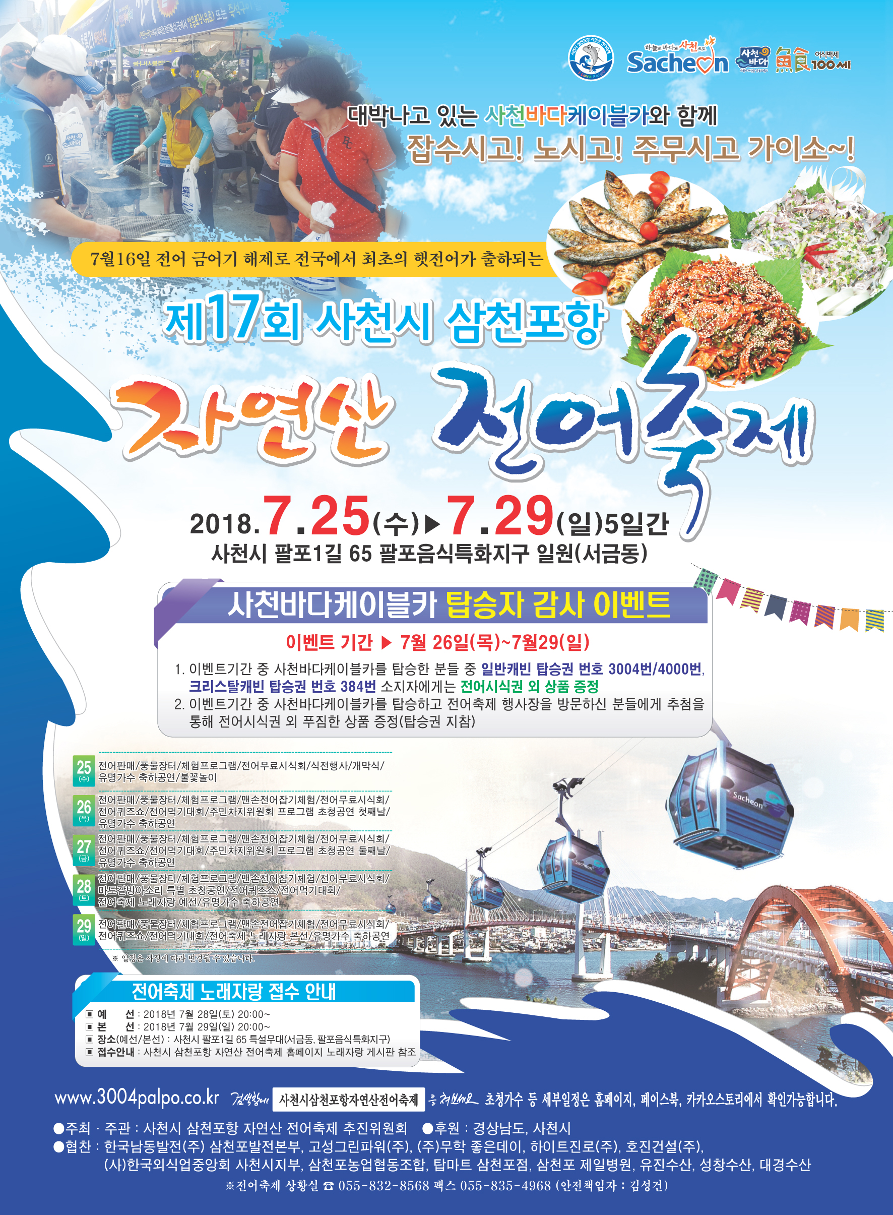“제17회 사천시 삼천포항 자연산 전어축제”는 2018년 7월 25일(수)부터 7월 29일(일)까지 5일간 경남 사천시 팔포1길 65(경상남도지정 팔포음식특화지구 일원)에서 유명 가수 초청공연과 함께 전어무료시식회, 맨손전어잡기 체험을 비롯한 다양한 체험/전시 등의 부대행사로 관람객 여러분을 맞이합니다.