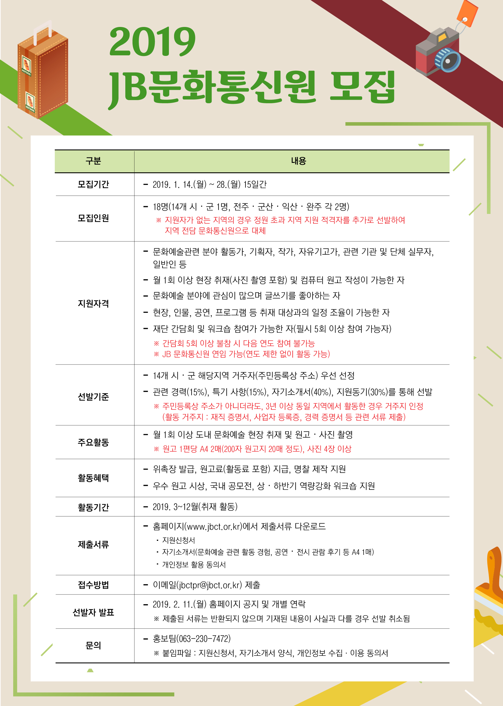 ()전라북도문화관광재단은 전라북도 문화예술 분야의 다양한 현장 소식과 정보를 공유할 JB문화통신원을 모집합니다. 많은 관심과 신청 바랍니다.