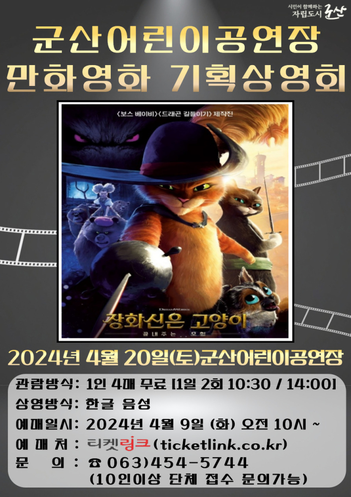 83 군산어린이공연장 4월 만화영화기획상영회 "장화신은 고양이: 끝내주는 모험" 안내 다운받기 예술의전당관리과 24.03.29 579