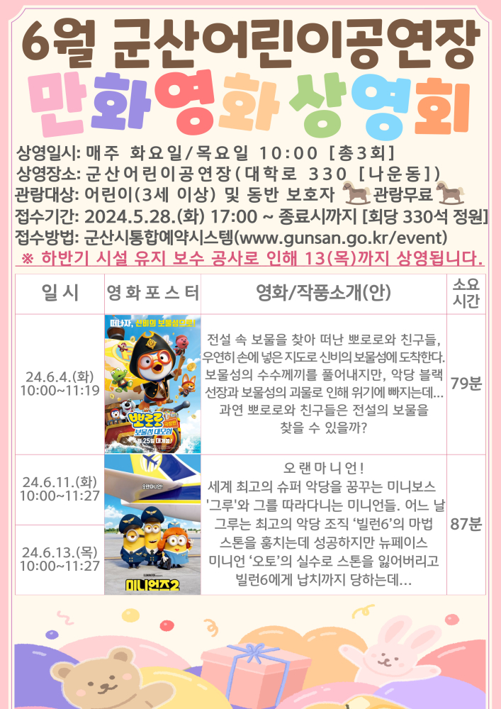 90 2024년 6월 군산어린이공연장 만화영화상영회 다운받기 예술의전당관리과 24.05.22 699