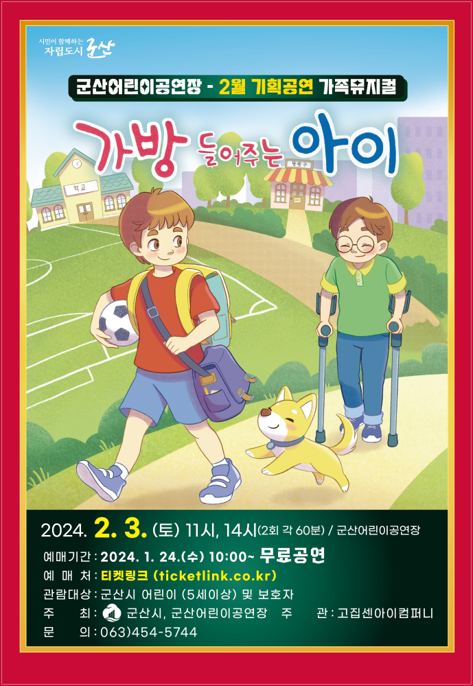 72 군산어린이공연장 2월 기획공연 '가방 들어주는 아이' 안내 다운받기 예술의전당관리과 24.01.22 602