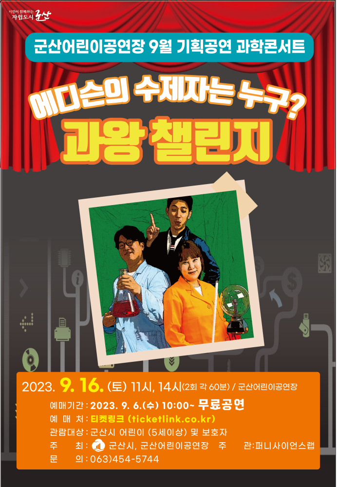 63 군산어린이공연장 9월 기획공연 '과왕 챌린지' 안내 다운받기 예술의전당관리과 23.09.13 812