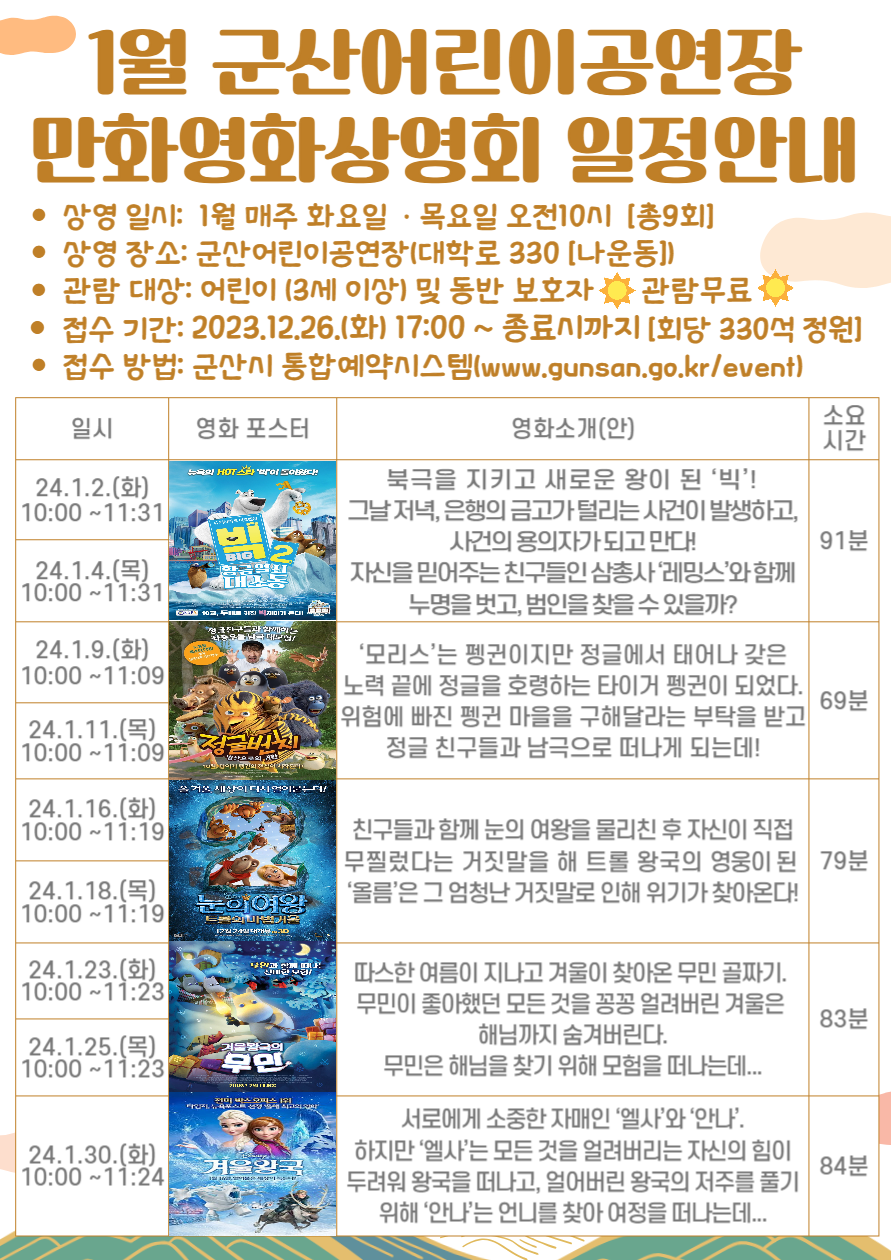 2024년 1월 군산어린이공연장 만화영화 상영회 일정 안내