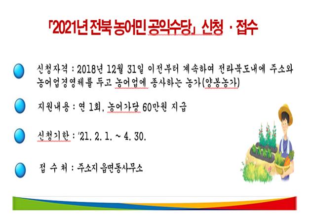 | 46 | 2021년 전라북도 농업·농촌 공익적 가치 지원사업(농민 공익수당) 신청 안내 |