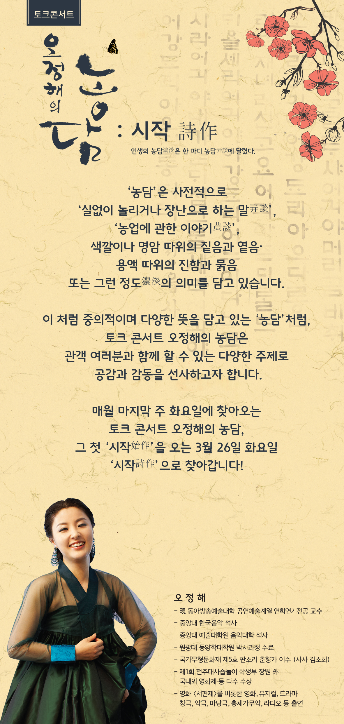 ‘농담’은 사전적으로 ‘실없이 놀리거나 장난으로 는 말(弄談)’, ‘농업에 관한 이야기(農談)’, 색깔이나 명암 따위의 짙음과 옅음, 용액 따위의 진함과 묽음 또는 그런 정도(濃淡)의 의미를 담고 있습니다. 이 처럼 중의적이며 다양한 뜻을 담고 있는 ‘농담’처럼, 토크 콘서트 오정해의 농담은 관객 여러분과 함께 할 수 있는 다양한 주제로 공감과 감동을 선사하고자 합니다. 매월 마지막 주 화요일에 찾아오는 토크 콘서트 오정해의 농담, 그 첫 ‘시작(始作)’을 오는 3월 26일 화요일 ‘시작(詩作)’ 으로 찾아갑니다!