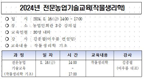 872 2024년 전문농업기술(작물생리학) 교육 알림(2024.8.16.금요일)) 다운받기 농촌지원과 24.08.07 618