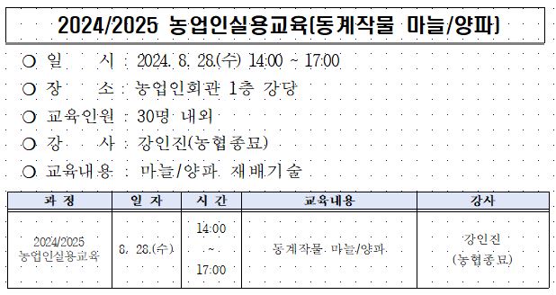 874 2024/2025 농업인실용교육(동계작물 마늘/양파) 다운받기 농촌지원과 24.08.19 580