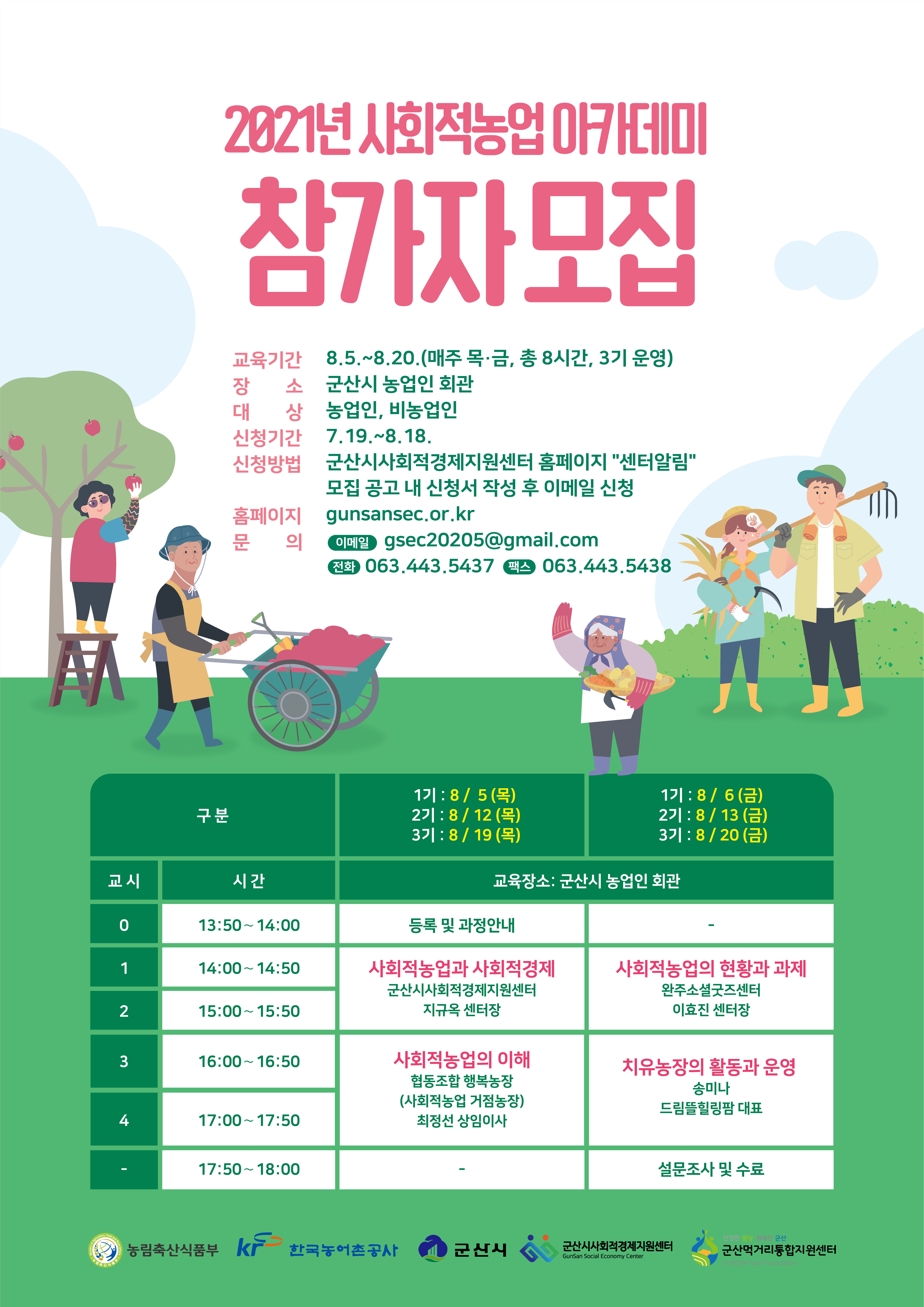 군산시사회적경제지원센터에서는 (재)군산먹거리통합지원센터와 군산시 사회적농업 활성화를 목적으로 '2021년 사회적농업 아카데미'를 운영하오니 많은 참가 부탁드립니다.