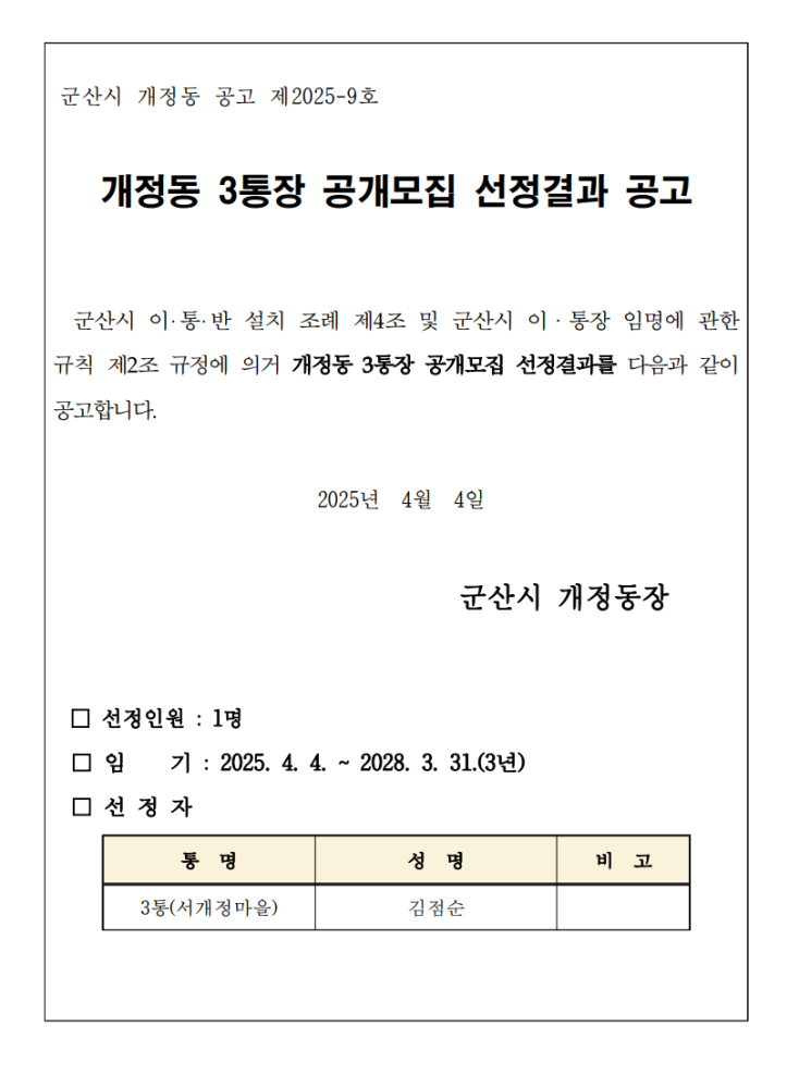 | 71 | 개정동 3통장 공개모집 선정결과 공고 |