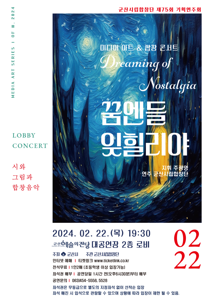132 군산시립합창단 제75회 기획연주회 '2024 미디어아트 시리즈 <꿈엔들 잊힐리야> 안내 다운받기 예술의전당관리과 24.02.16 767