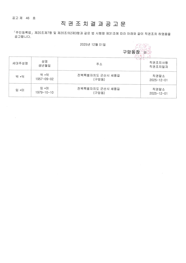 325 2025년 주민등록 사실조사에 따른 무단전출자 직권조치 결과 공고 다운받기 구암동 25.12.04 39