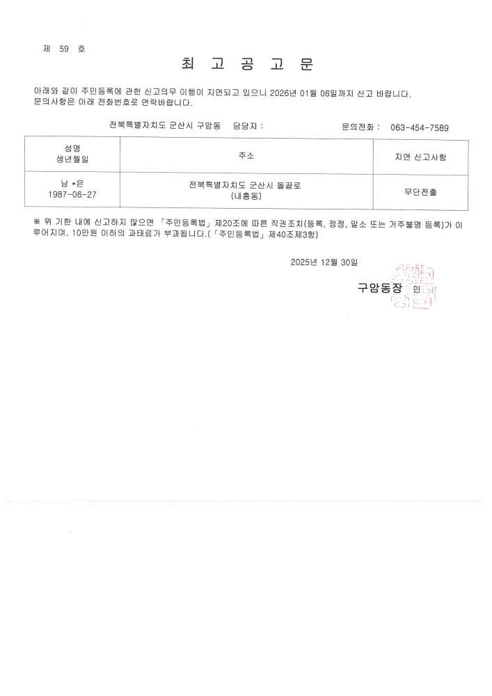 | 314 | 주민등록 신고의무 불이행자의 최고장 반송에 따른 최고 공고 |