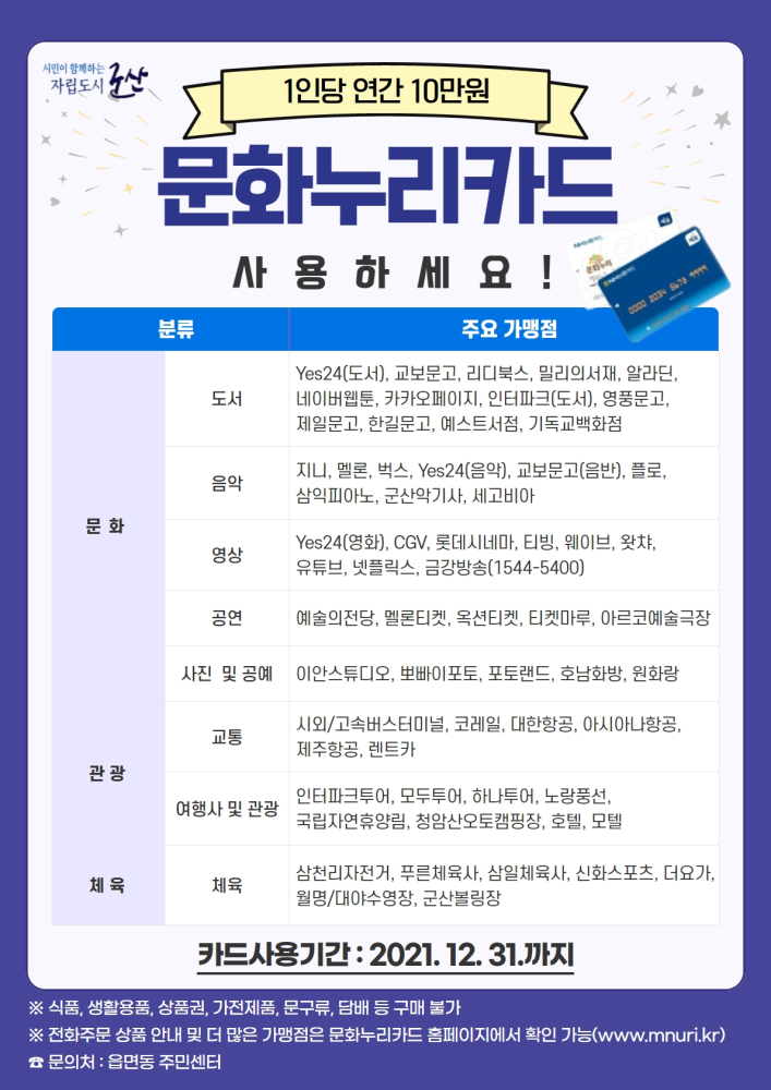 | 719 | 2021년 문화누리카드 사용안내(사용기간: 2021.12.31까지) |