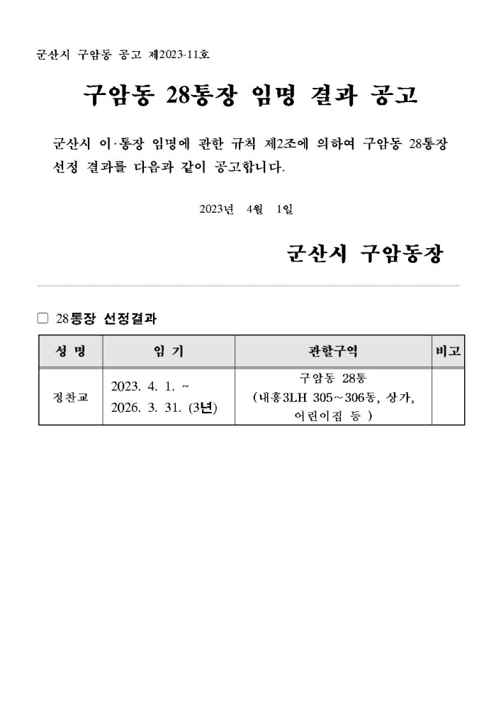 | 860 | 구암동 28통장 임명 결과 공고(4.1일자) |