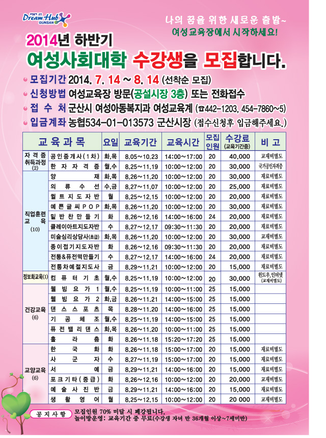 | 2475 | 2014년 하반기 여성사회대학 수강생 모집 |