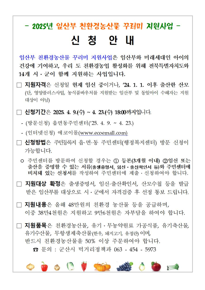 | 12 | (종료) 2025년 임산부 친환경농산물 꾸러미 지원사업 신청 안내 |