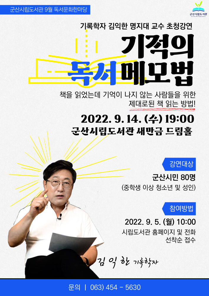 군산시립도서관 홈페이지(lib.gunsan.go.kr) 또는 전화(454-5630)를 통해 참여 신청이 가능하십니다