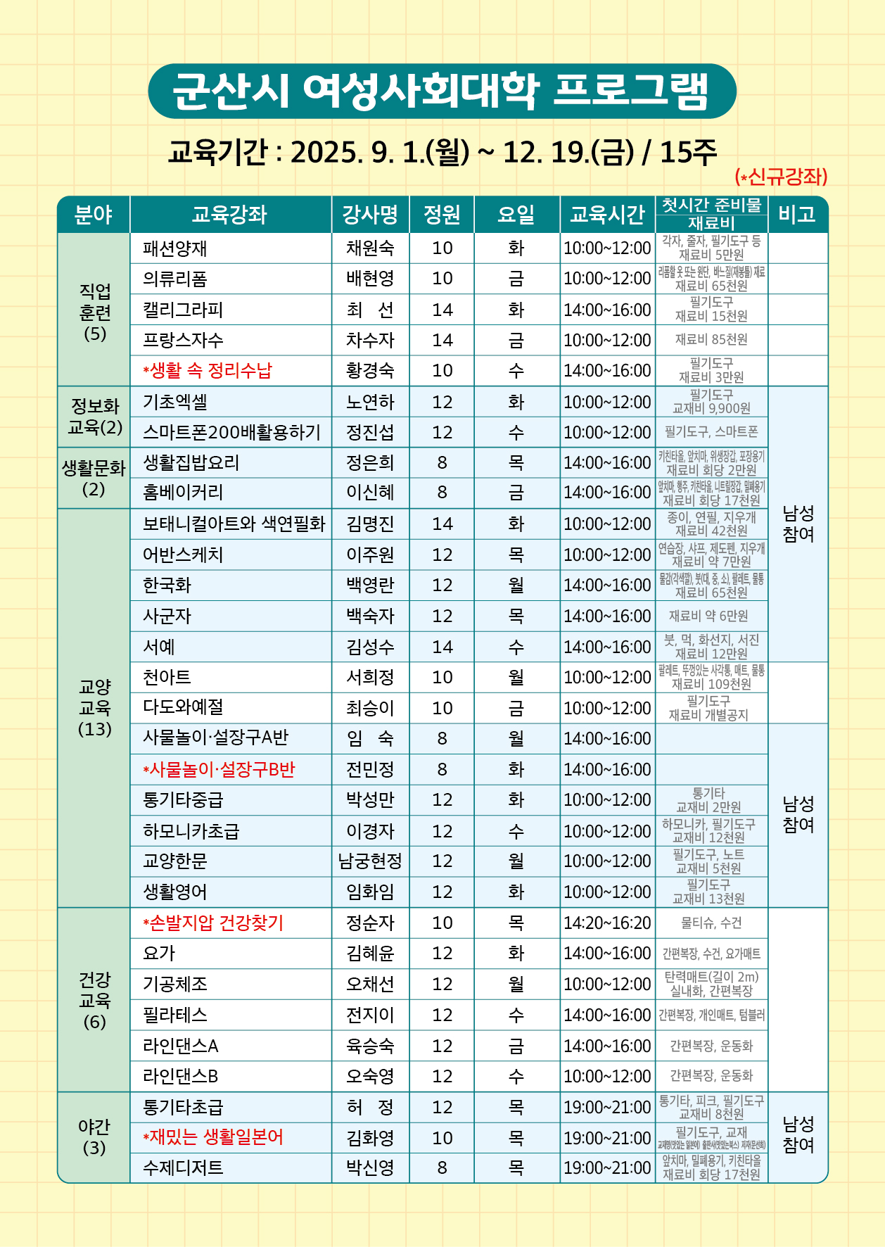 2. 모집대상 : 군산시 여성 및 일부강좌 남성 참여