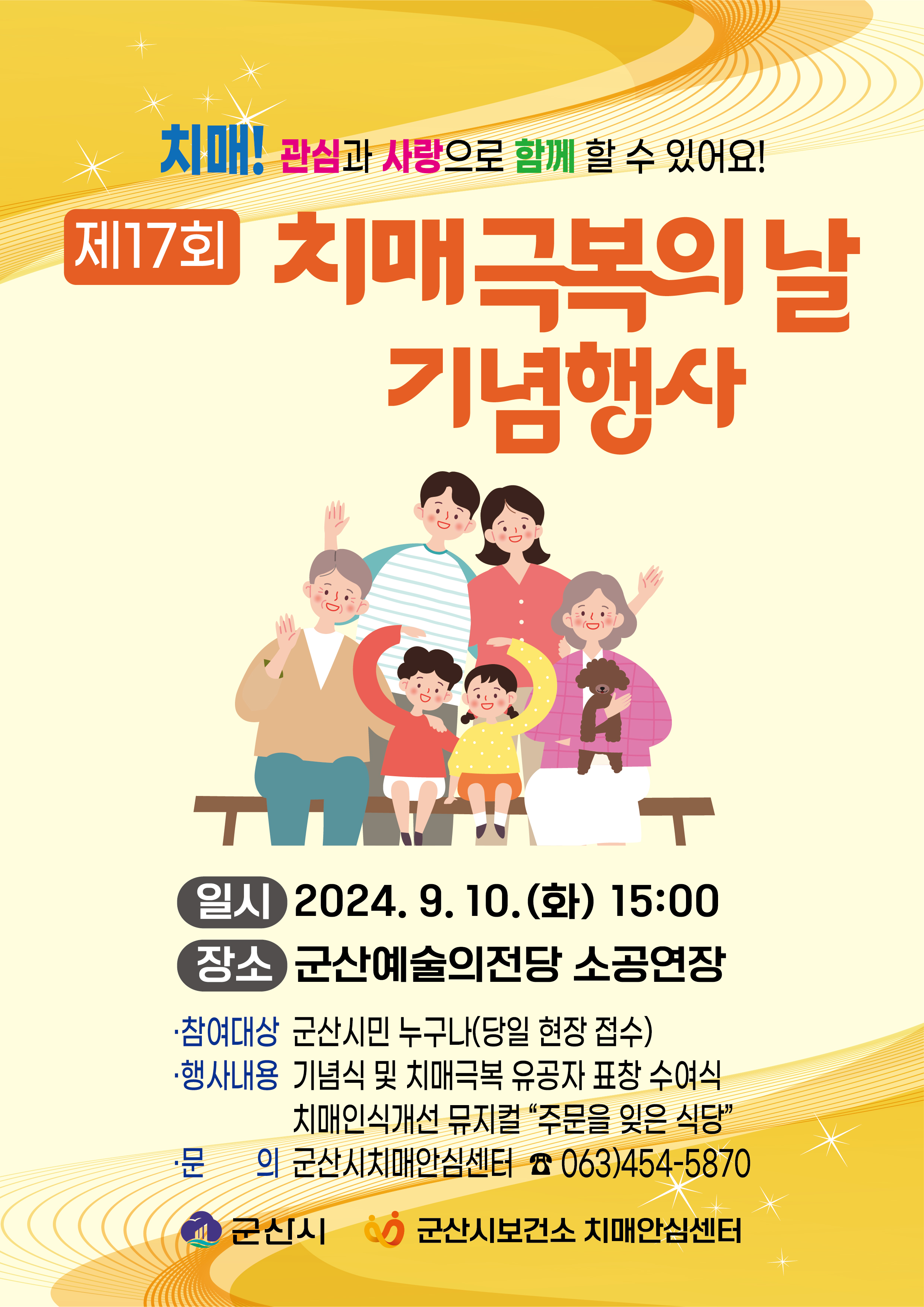 군산시보건소 치매안심센터에서 주관하는 제17회 치매극복의 날 기념행사에 많은 참여 바랍니다.