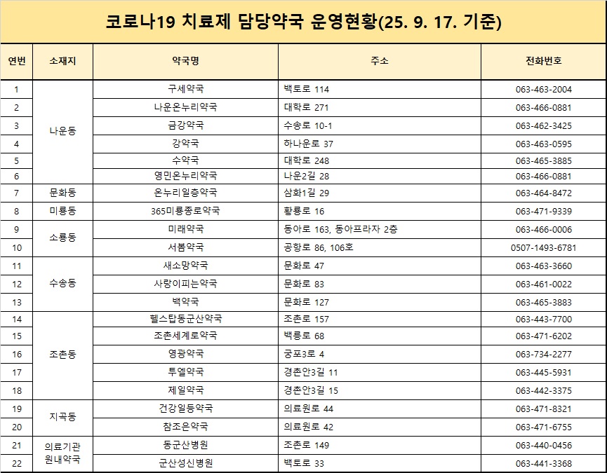 25. 9. 17. 기준, 코로나19 먹는치료제(라게브리오) 담당약국 운영현황 안내드립니다.