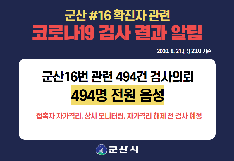 43 군산 16번 확진자 관련 코로나19 검사 결과 알림(8월 21일 23시 기준) 다운받기 총관리자 20.08.22 4043