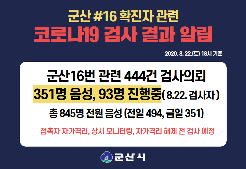 44 군산16번 확진자 관련 코로나19 검사 결과 알림(8월 22일 18시 기준) 다운받기 총관리자 20.08.22 3299