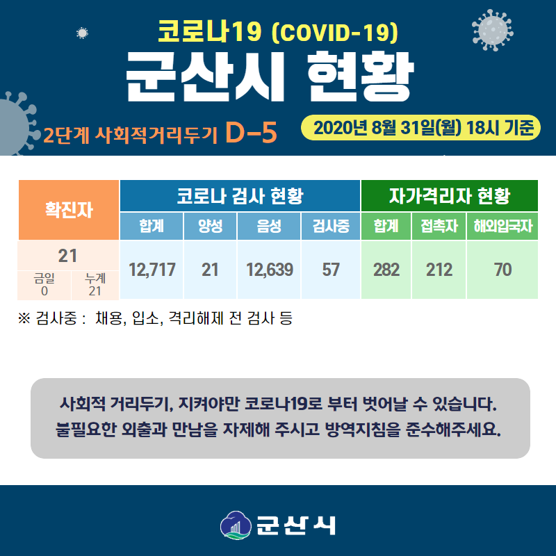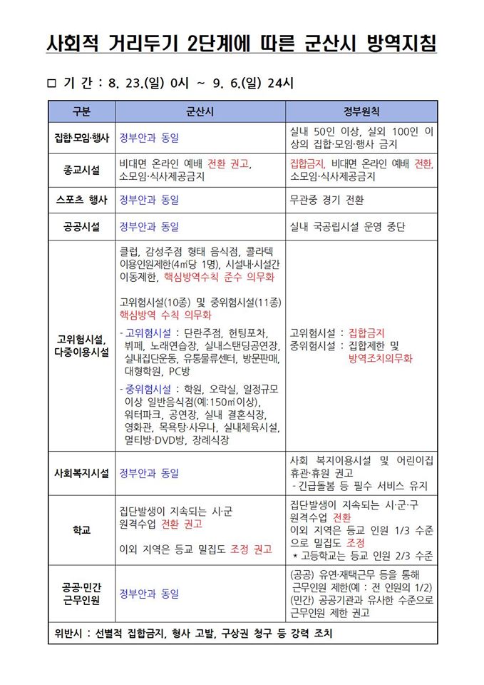 45 사회적 거리두기 2단계에 따른 군산시 방역지침(8월 23일 0시 ~ 9월 6일 24시) 다운받기 총관리자 20.08.23 6616