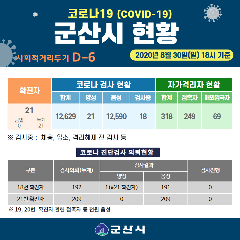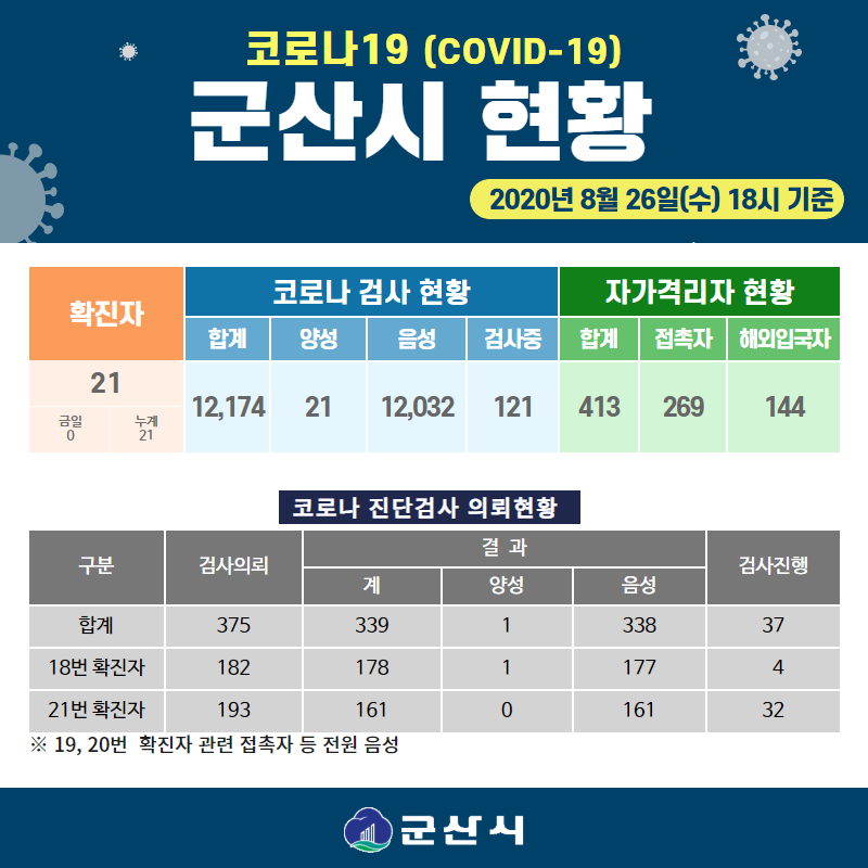 46 코로나19 군산시 현황[2020년 8월 26일(수) 18시 기준] 다운받기 총관리자 20.08.27 2704