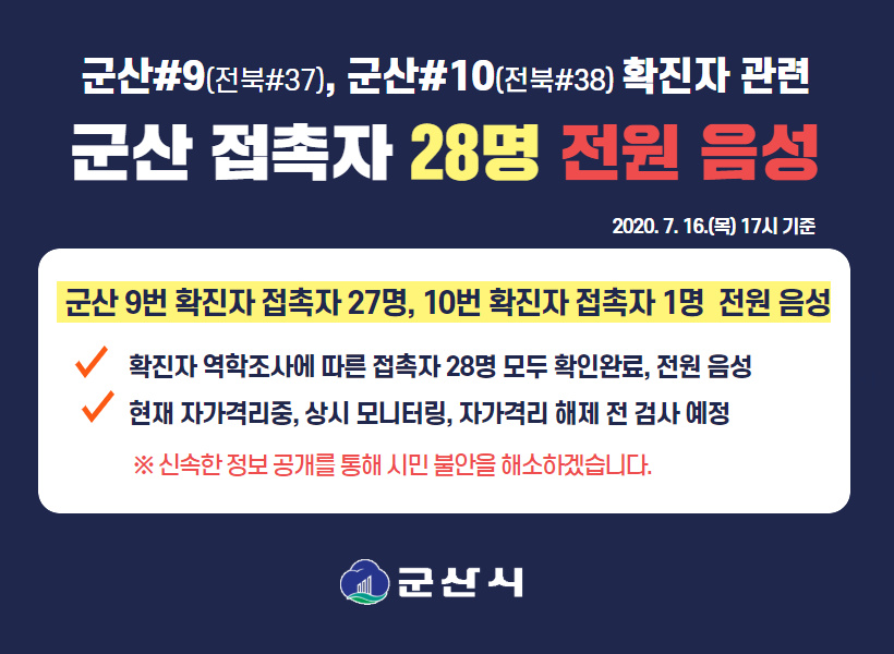 35 군산9, 10번째 확진자 접촉자 28명 자가격리 해제전 검사결과 전원 음성 다운받기 총관리자 20.07.28 1336