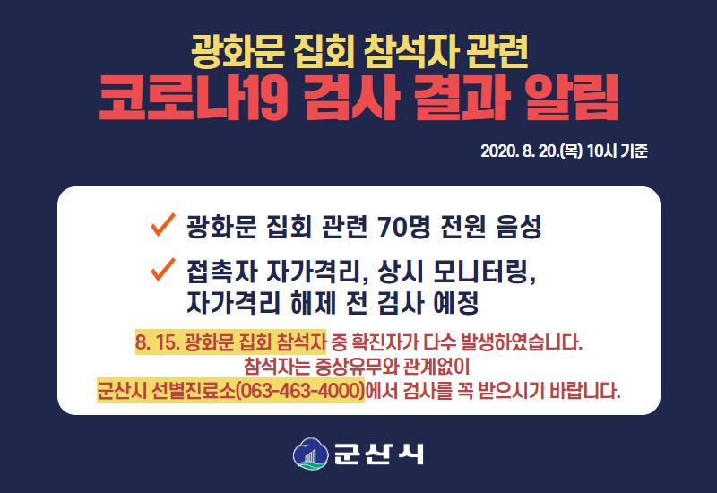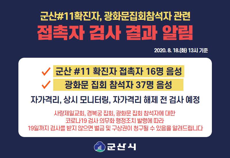 37 군산11번 확진자, 광화문집회참석자 관련 접촉자 검사 결과 알림(8월 18일 13시 기준) 다운받기 총관리자 20.08.18 2154