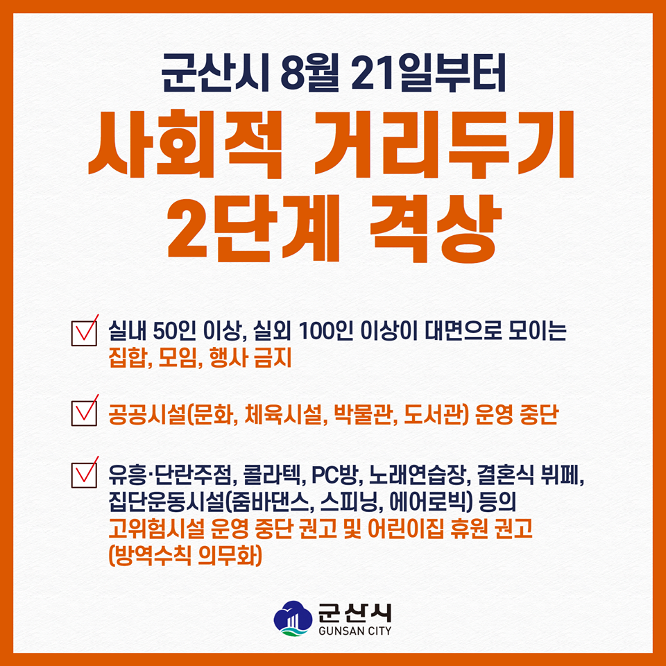 41 군산시 8월 21일부터 사회적 거리두기 2단계 격상 다운받기 총관리자 20.08.21 7120