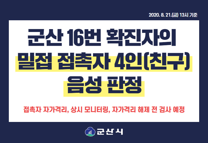 42 군산 16번 확진자의 밀접 접촉자 4인(친구) 음성 판정 다운받기 총관리자 20.08.21 5401