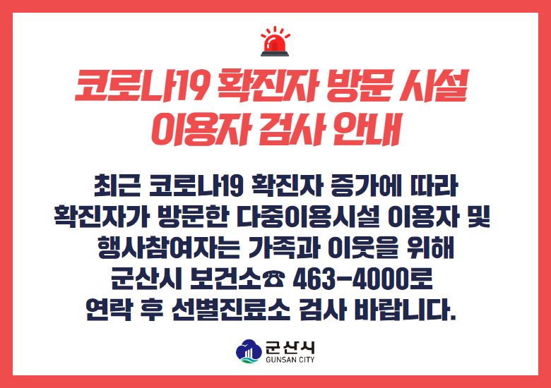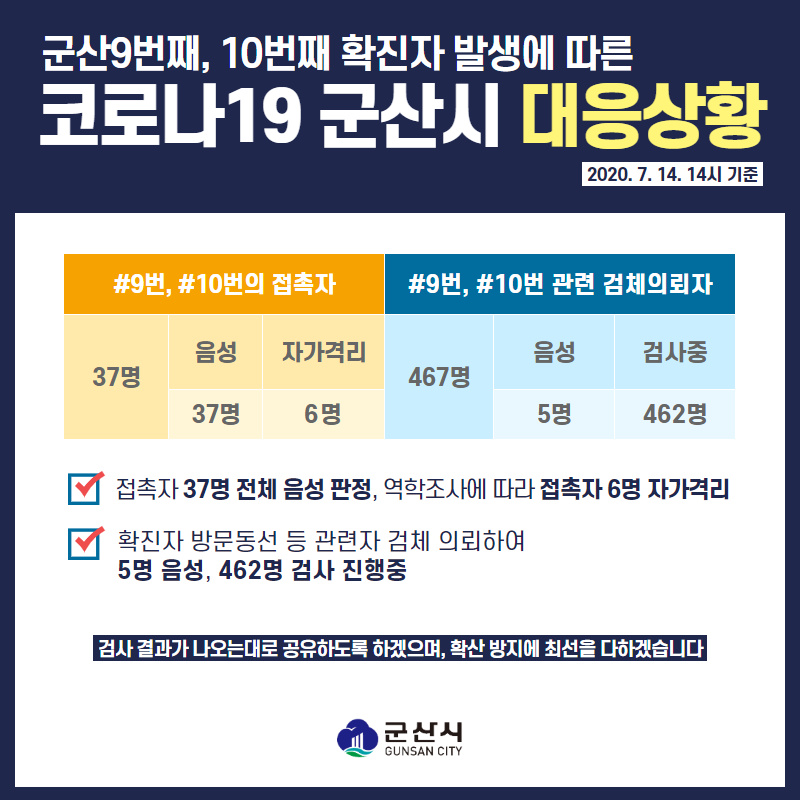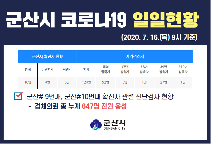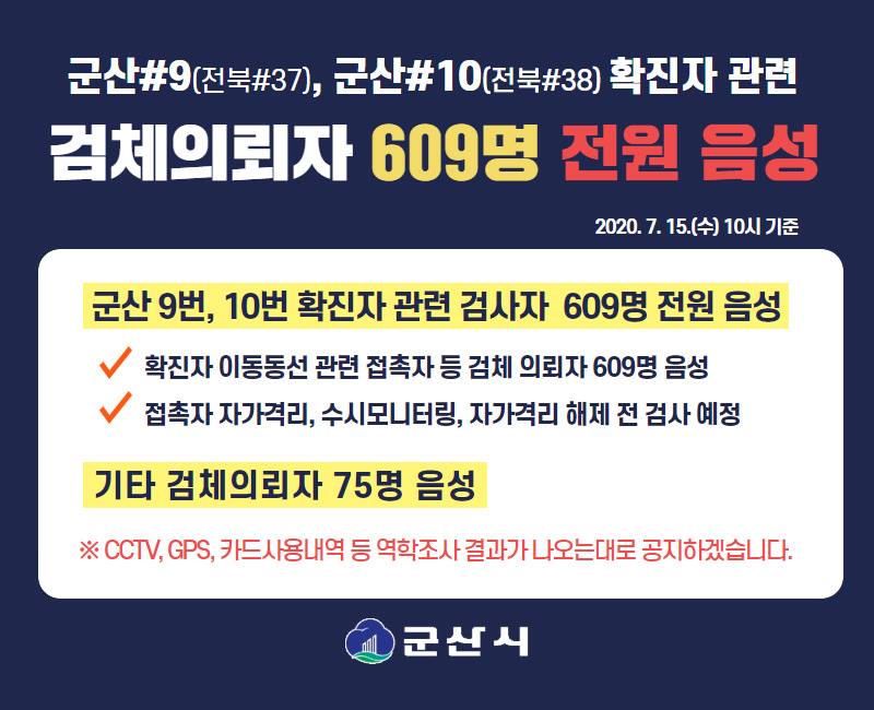 29 군산 9번, 10번 확진자 관련 검사자 609명 전원 음성[7.15.(수) 10시 기준] 다운받기 총관리자 20.07.15 1355