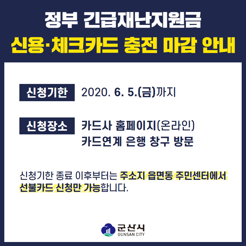 26 정부 긴급재난지원금 신용·체크카드 충전 마감 안내 다운받기 총관리자 20.06.02 1248