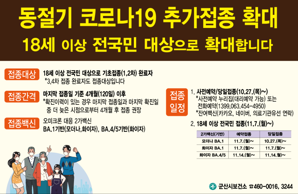 938 코로나19 동절기 추가접종 18세 이상 대국민대상으로 확대합니다. 다운받기 건강관리과 22.11.14 1621