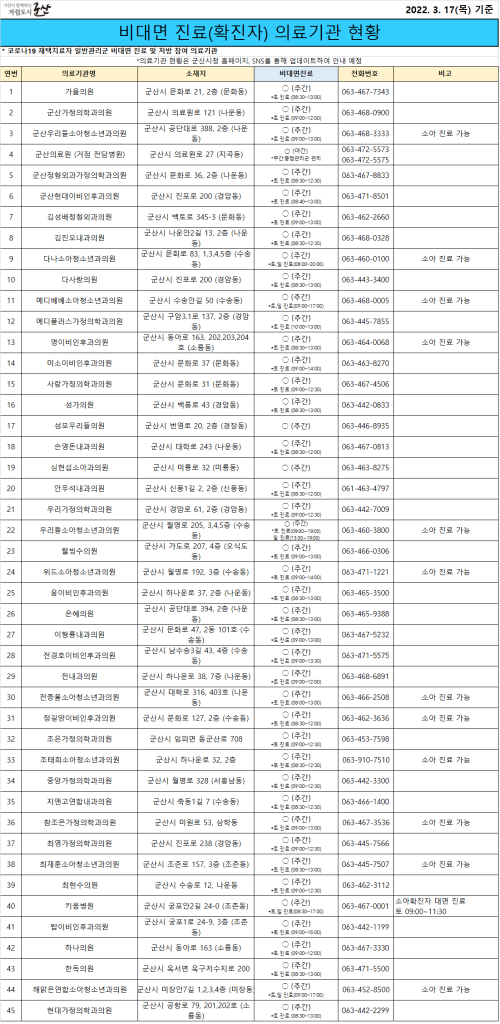 전문가용신속항원 검사,비대면진료(확진자)의료기관현황(3월17일목요일기준)