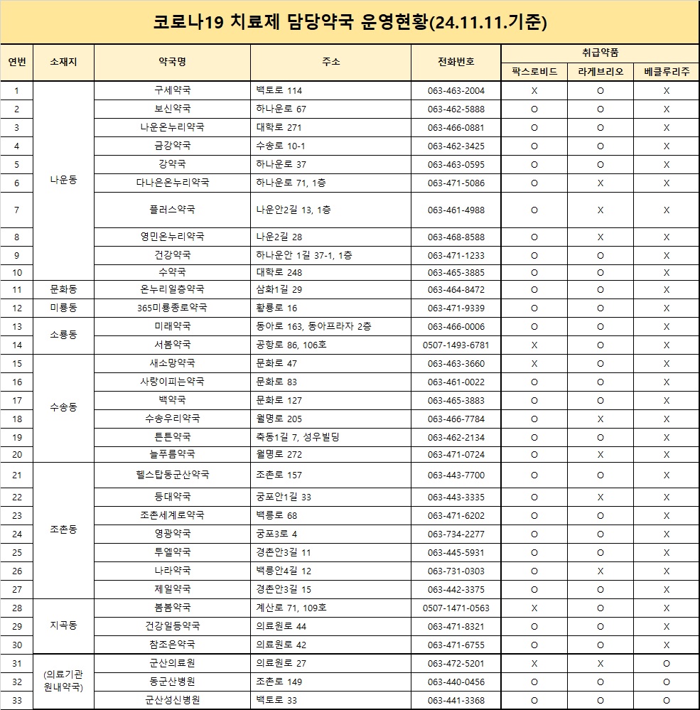군산시 코로나19 치료제 담당약국 운영현황 안내드립니다.