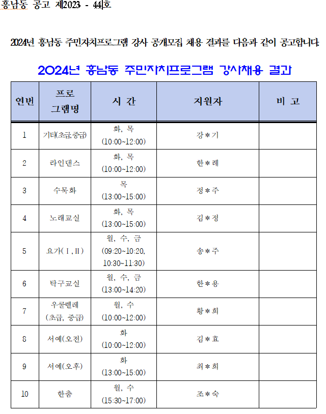 | 330 | 2024년 흥남동 주민자치센터 프로그램 강사 모집 공고 |